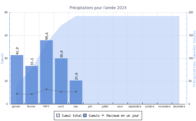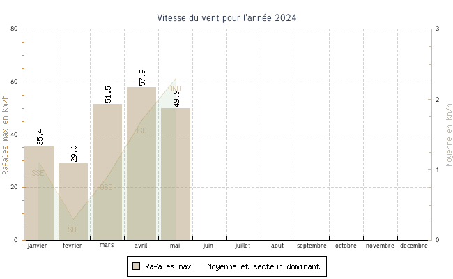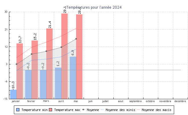 | avril | 1.2 °C | 6.8 °C | 29.1 °C | 17.5 °C | 11.8 °C | 1.7 km/h | 57.9 km/h | OSO |